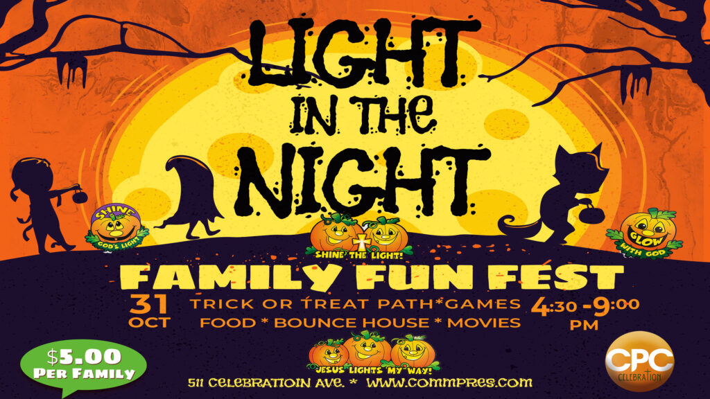 Join us for a glowing good time at our Light in the Night Family Fun Fest on Friday, October 31st from 4:30 PM – 9:00 PM at Community Presbyterian Church in Celebration! This family-friendly evening is a safe and joy-filled alternative to Halloween — where we come together to shine God’s light and celebrate community […]