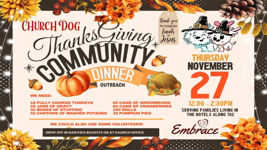 Join us for a heart–warming Thanksgiving celebration as Church Dog hosts our annual Thanksgiving Community Dinner Outreach — a special event dedicated to serving families living in the hotels along 192.Come experience the love of Jesus in action on Thursday, November 27 from 12:00 PM – 2:30 PM! This community meal is all about blessing […]