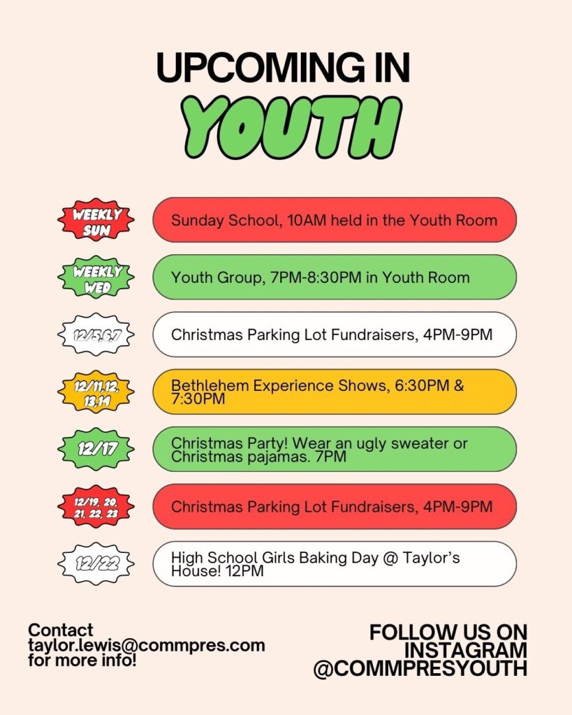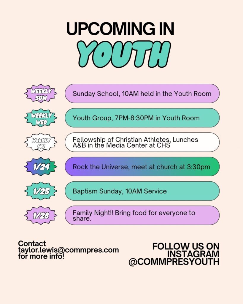 CommPres Youth (CPY) is a student ministry at Community Presbyterian Church for all 6th-12th grade students.